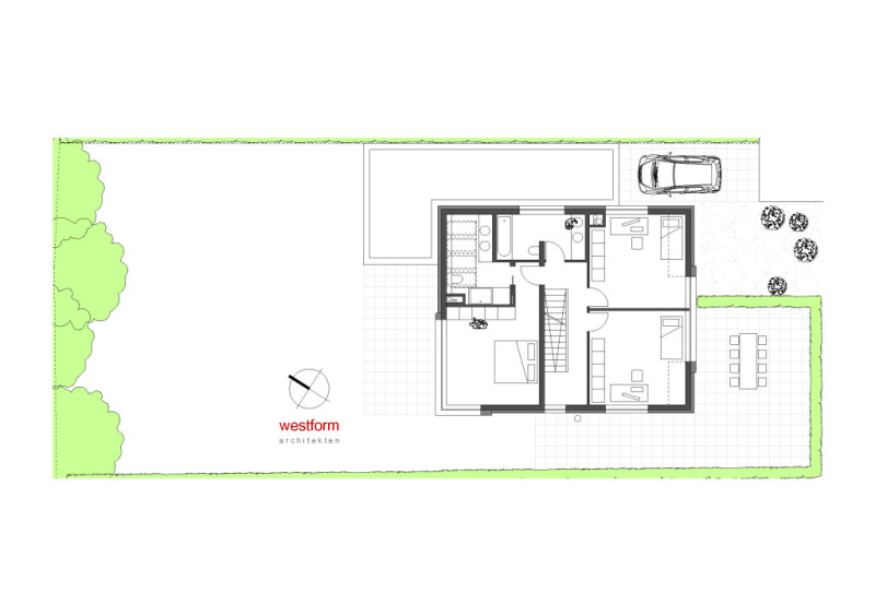 Westen und der Südterrasse. Im Obergeschoss sind zwei Kinderzimmer